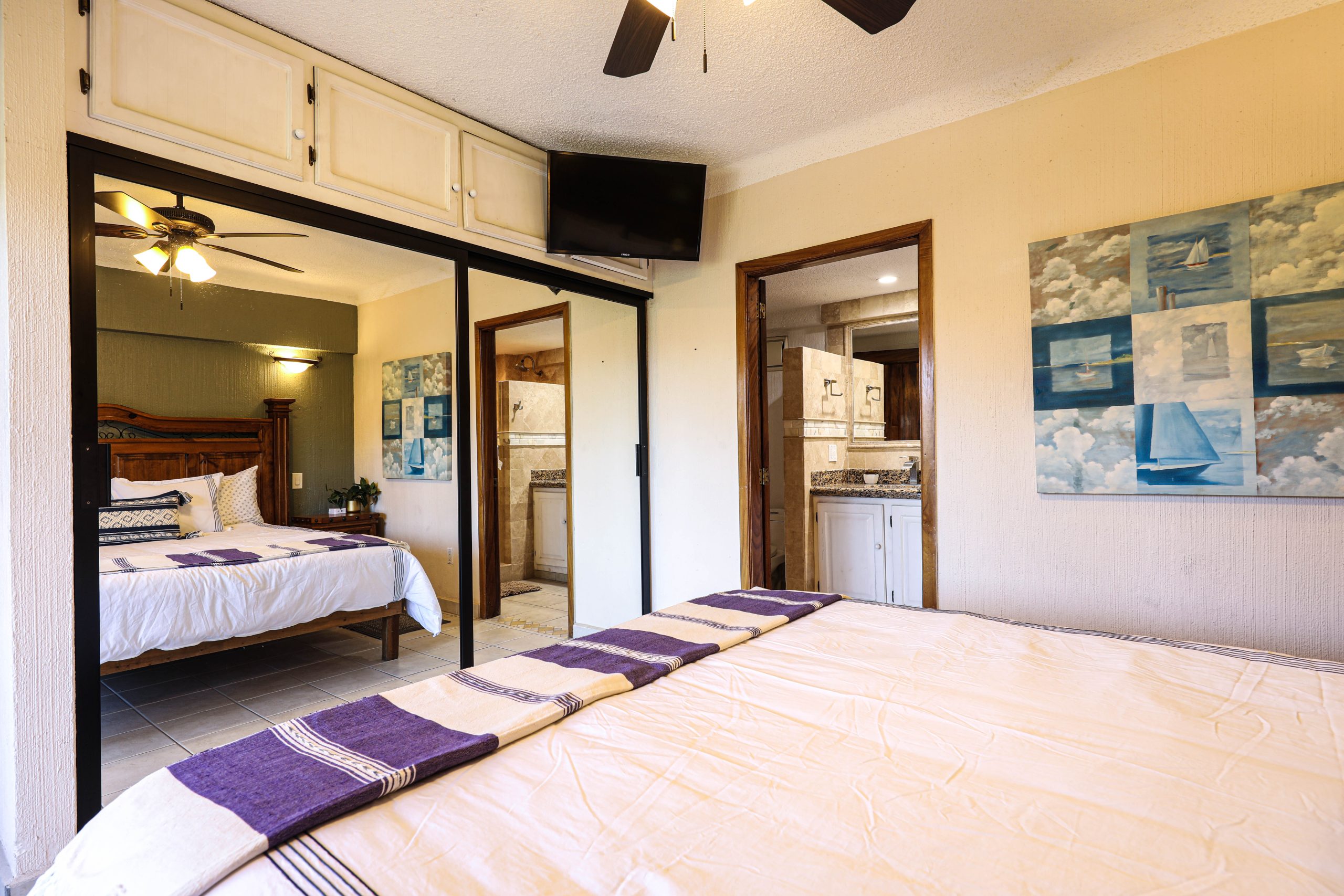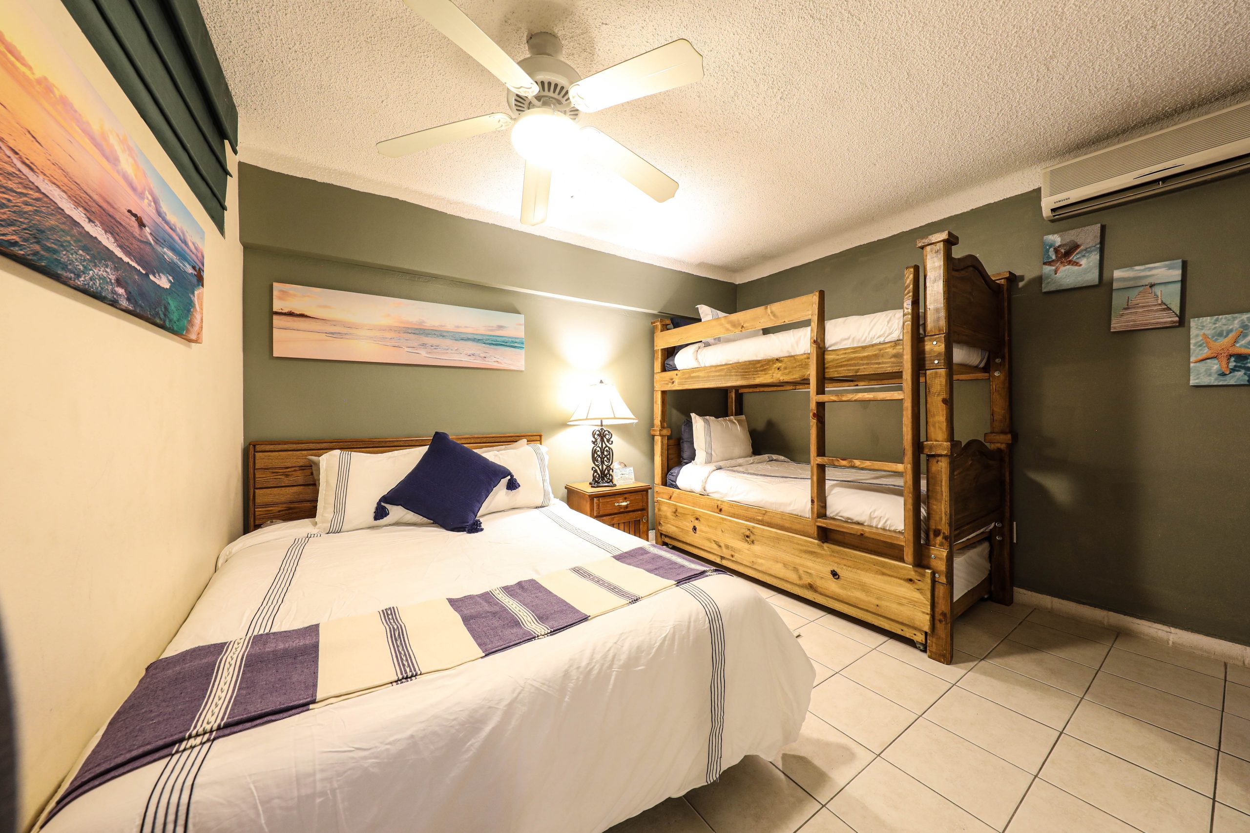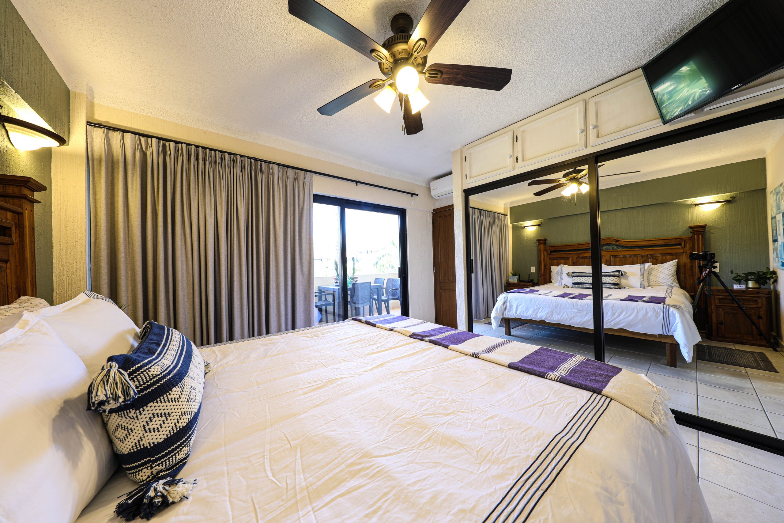 Located in the heart of Cabo San Lucas, one block from the famous Medano beach, a 5-minute walk to the center of Cabo and the Marina is this beautiful condo which can sleep up to six guests with a King bed in the master bedroom and a Queen and Bunkbeds in the second bedroom, there are two full bathrooms with all the amenities plus hair dryers. The Kitchen has everything to satisfy all your cooking needs. Also, there is filtered water in both bathrooms. For your convenience there is also a 5-gallon purified water dispenser for hot and cold water in the dining area. Eat at the large dining table that seats 6 or BBQ your catch of the day on the spacious Patio while you are enjoying the beautiful view of the courtyard and pool. Quiet air conditioning and ceiling fans in each room keeps you cool during the warm summer nights. For your entertainment a 65” Flat Screen Smart TV in the living room with hundreds of channels to chose from (USA, Canadian and Spanish) and 40” Flat Screen Smart TVs are in both bedrooms. This condo has its own dedicated Fiber Optic Internet service (150 Mbps) plus phone service with free Local & International calling.