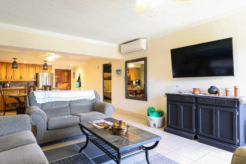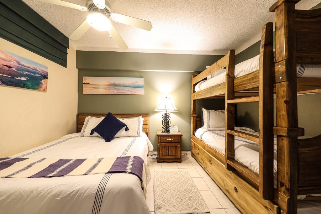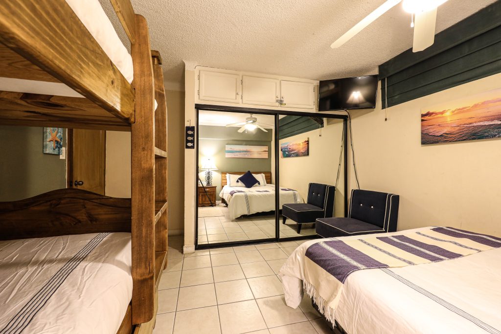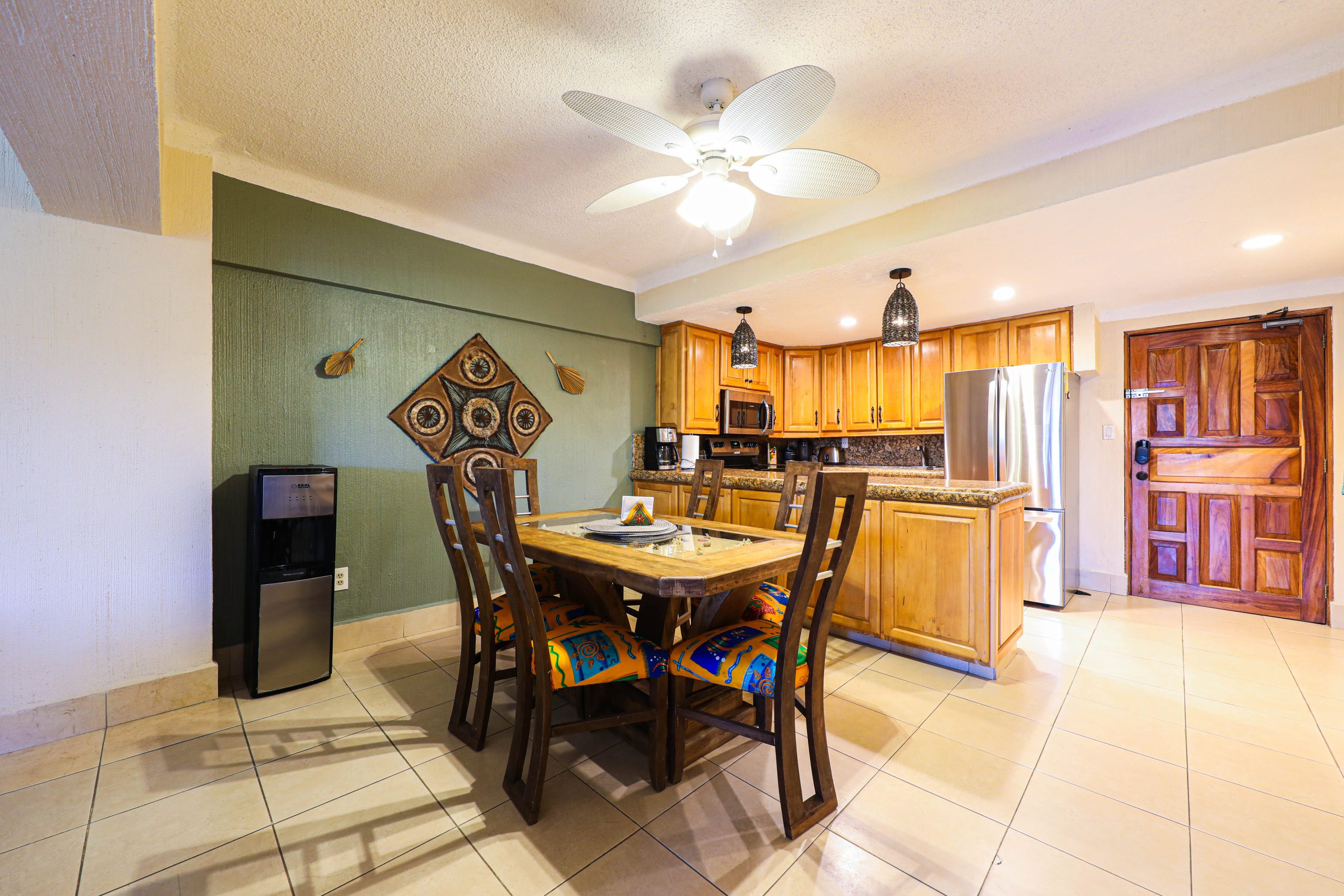 Located in the heart of Cabo San Lucas, one block from the famous Medano beach, a 5-minute walk to the center of Cabo and the Marina is this beautiful condo which can sleep up to six guests with a King bed in the master bedroom and a Queen and Bunkbeds in the second bedroom, there are two full bathrooms with all the amenities plus hair dryers. The Kitchen has everything to satisfy all your cooking needs. Also, there is filtered water in both bathrooms. For your convenience there is also a 5-gallon purified water dispenser for hot and cold water in the dining area. Eat at the large dining table that seats 6 or BBQ your catch of the day on the spacious Patio while you are enjoying the beautiful view of the courtyard and pool. Quiet air conditioning and ceiling fans in each room keeps you cool during the warm summer nights. For your entertainment a 65” Flat Screen Smart TV in the living room with hundreds of channels to chose from (USA, Canadian and Spanish) and 40” Flat Screen Smart TVs are in both bedrooms. This condo has its own dedicated Fiber Optic Internet service (150 Mbps) plus phone service with free Local & International calling.