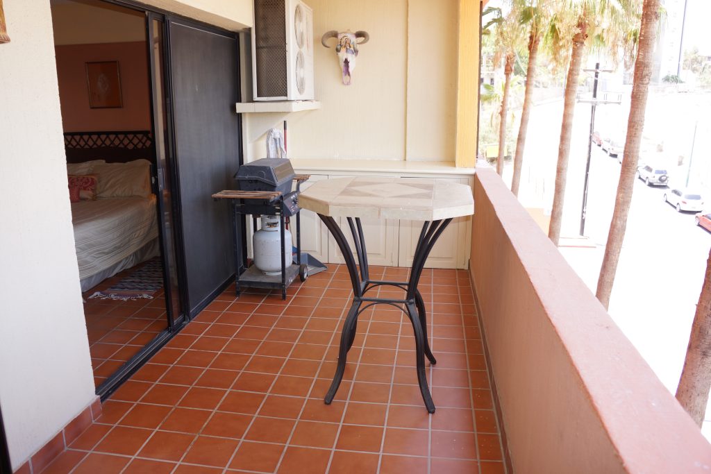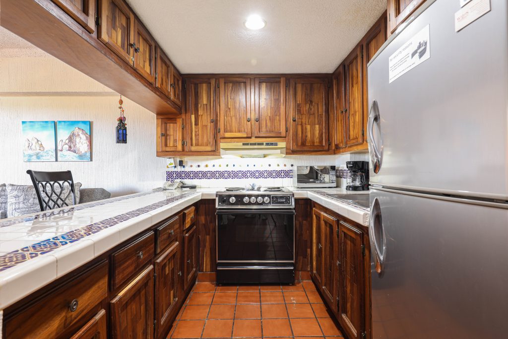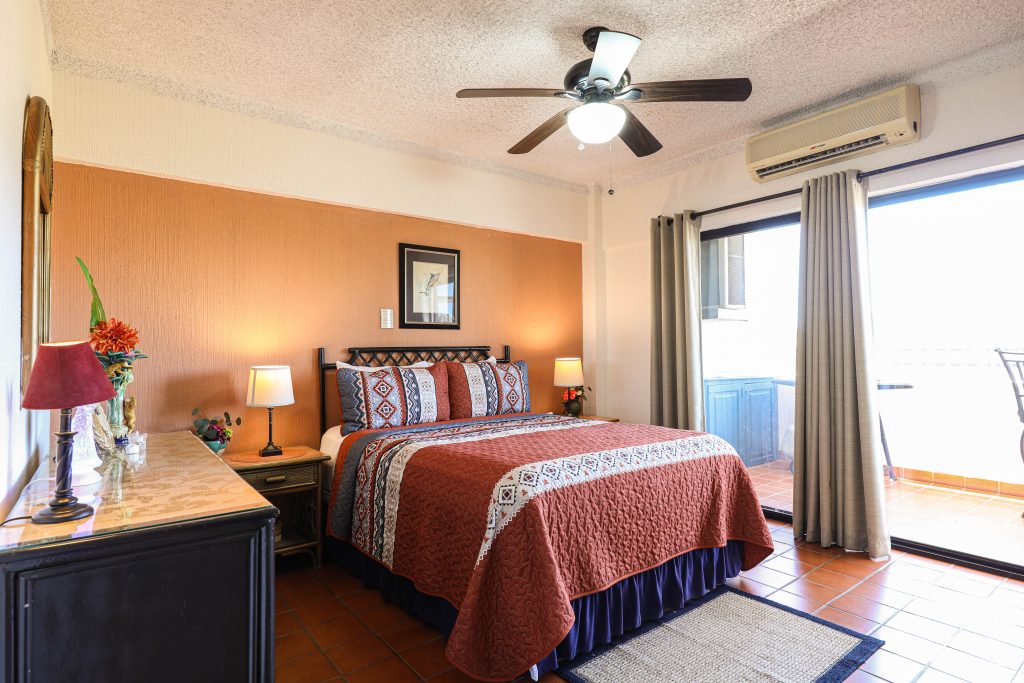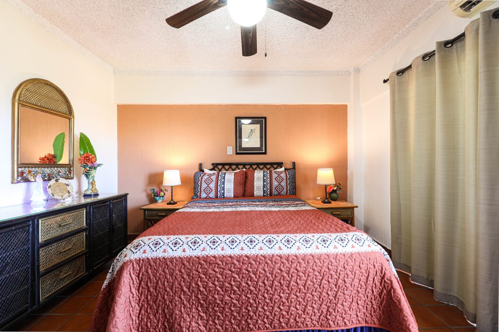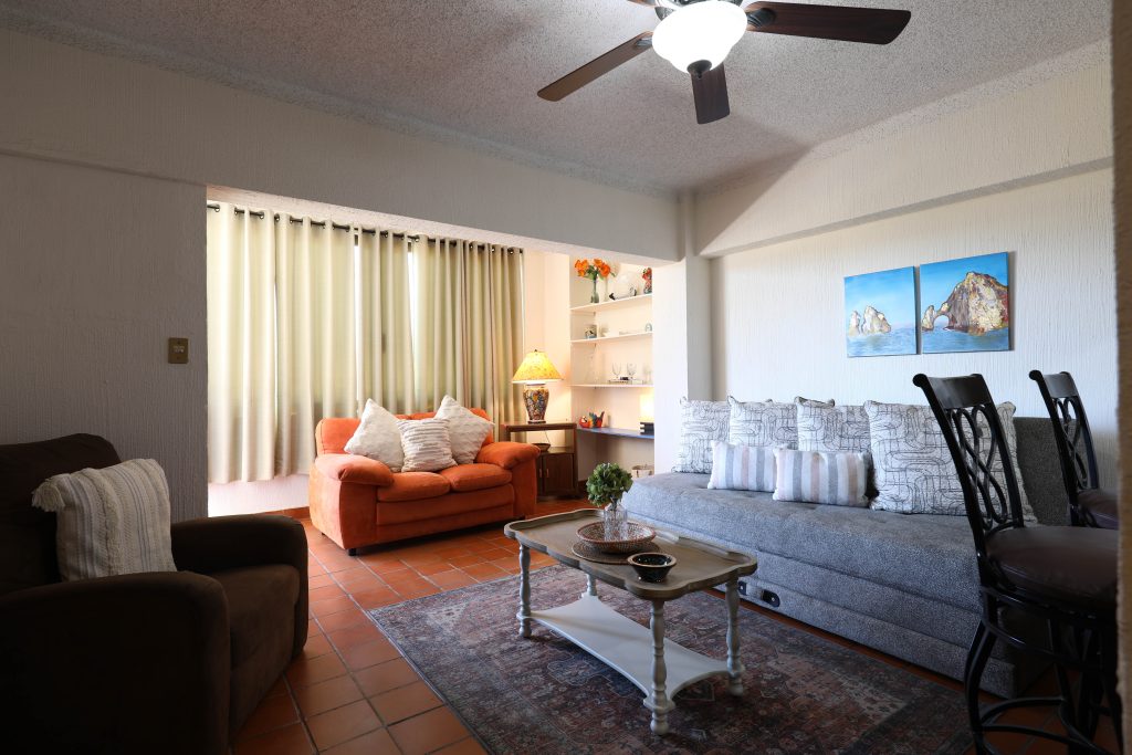 Located in the heart of Cabo San Lucas, one block from the famous Medano beach, a 5-minute walk to the center of Cabo and the Marina is this beautiful 1-bedroom condo which can sleep up to four guests with a Queen bed in the master bedroom and a Queen Sofa bed in the living room, there is one full bathroom with a hair dryer. The Kitchen has everything to satisfy all your cooking needs, for your convenience there is a 5-gallon purified water dispenser for hot and cold water. BBQ your catch of the day on the spacious Patio while you are enjoying the beautiful view of Cabo San Lucas or dine poolside at 'Tres Amigas Cantina' restaurant and bar, they serve Breakfast, Lunch and Dinner at very reasonable prices. If you caught some fish, they will happily cook it for you any style you ask for. Quiet air conditioning and ceiling fans in each room keeps you cool during the warm summer nights. For your entertainment a 43” Flat Screen Smart TV is provided in the living room. A 40” Flat Screen Smart TV is in the bedroom. This condo has its own dedicated Fiber Optic Internet service (60 Mbps) plus phone service with free Local & International calling.