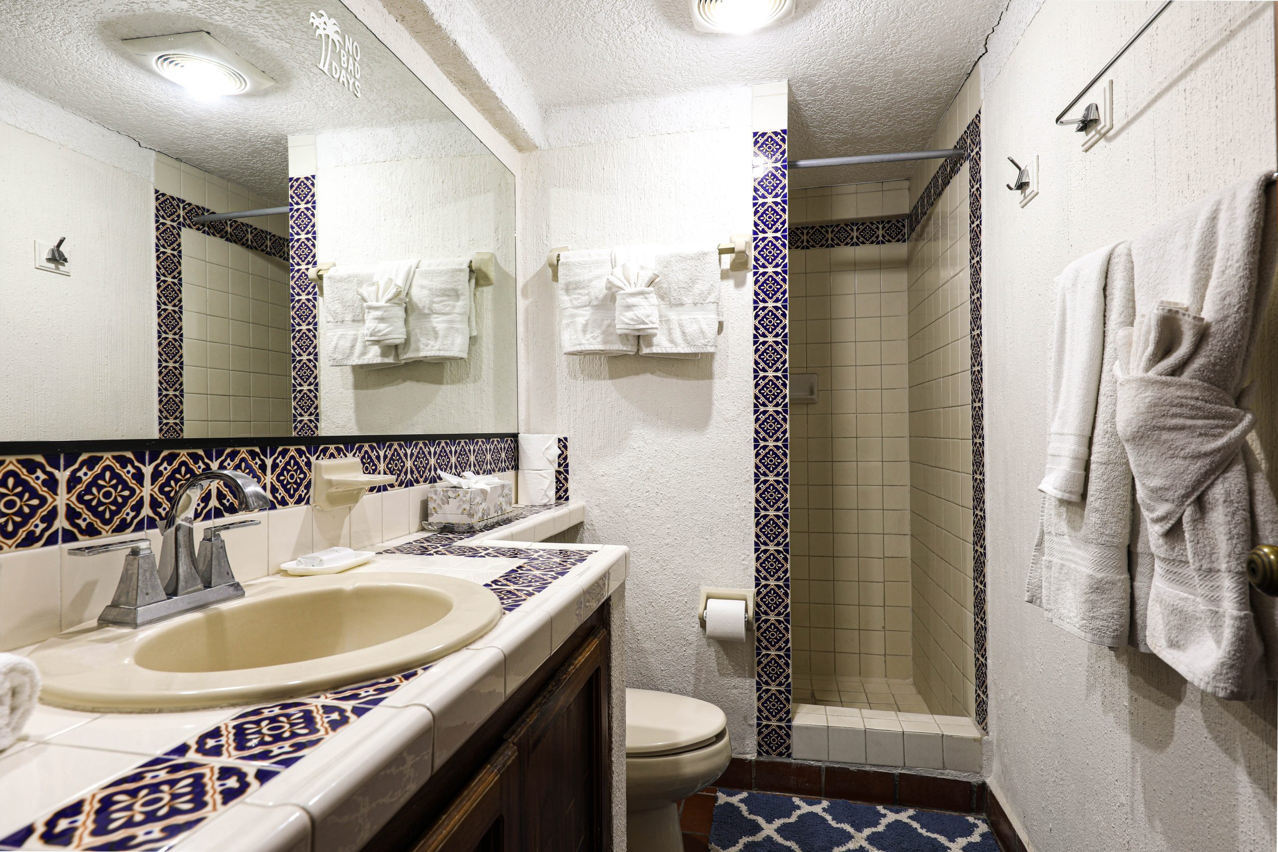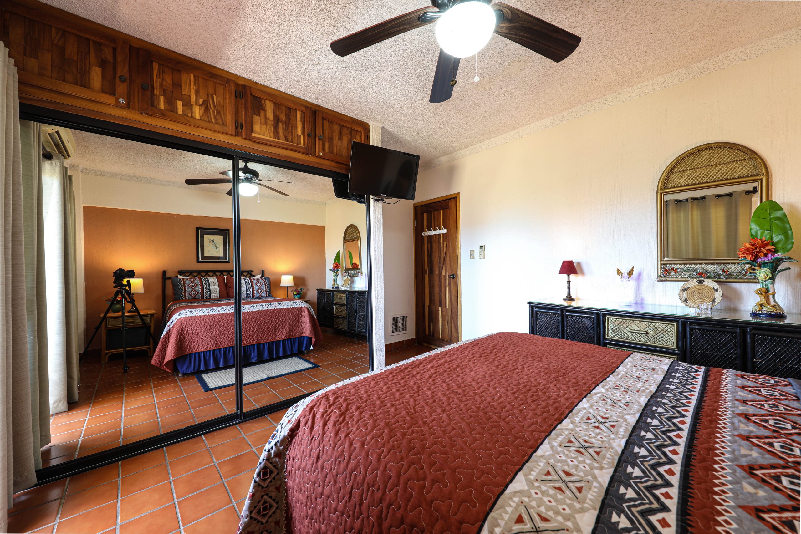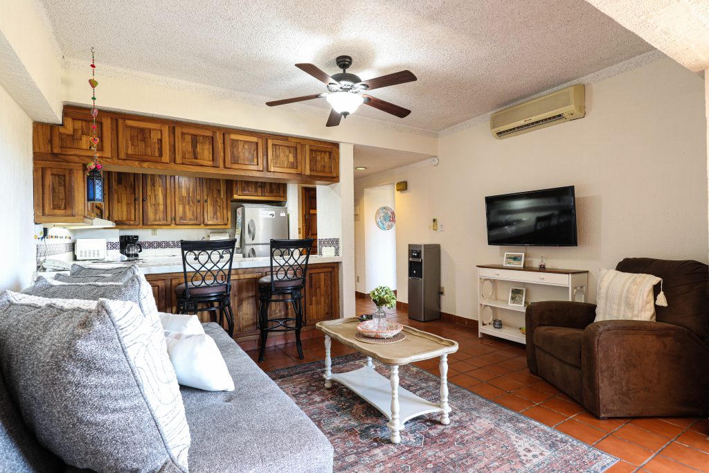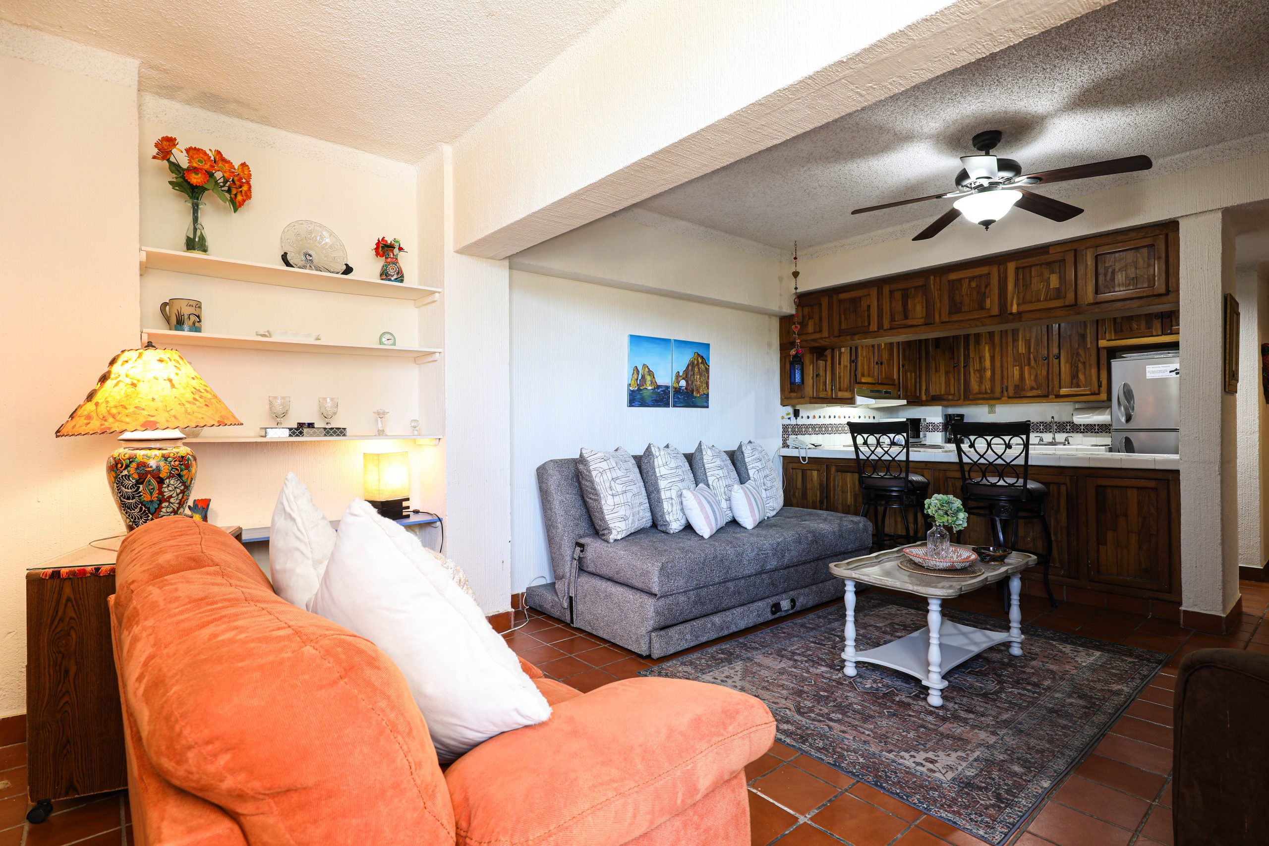 Located in the heart of Cabo San Lucas, one block from the famous Medano beach, a 5-minute walk to the center of Cabo and the Marina is this beautiful 1-bedroom condo which can sleep up to four guests with a Queen bed in the master bedroom and a Queen Sofa bed in the living room, there is one full bathroom with a hair dryer. The Kitchen has everything to satisfy all your cooking needs, for your convenience there is a 5-gallon purified water dispenser for hot and cold water. BBQ your catch of the day on the spacious Patio while you are enjoying the beautiful view of Cabo San Lucas or dine poolside at 'Tres Amigas Cantina' restaurant and bar, they serve Breakfast, Lunch and Dinner at very reasonable prices. If you caught some fish, they will happily cook it for you any style you ask for. Quiet air conditioning and ceiling fans in each room keeps you cool during the warm summer nights. For your entertainment a 43” Flat Screen Smart TV is provided in the living room. A 40” Flat Screen Smart TV is in the bedroom. This condo has its own dedicated Fiber Optic Internet service (60 Mbps) plus phone service with free Local & International calling.